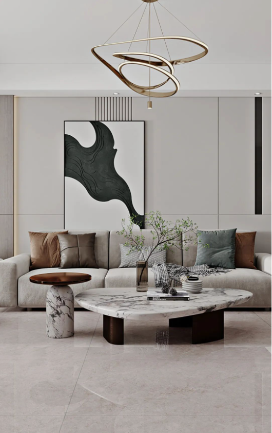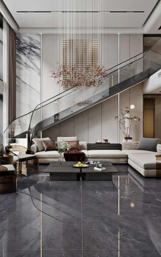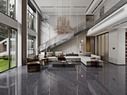 客廳采用挑高設計,不僅能增強室內(nèi)采光效果,同時突出空間錯落有致的層次感,讓客廳高級感瞬間拉滿,加上斯克深灰獨一無二的紋理,無論檔次、質(zhì)感、氣場,都透露著別具一格的藝術氛圍。